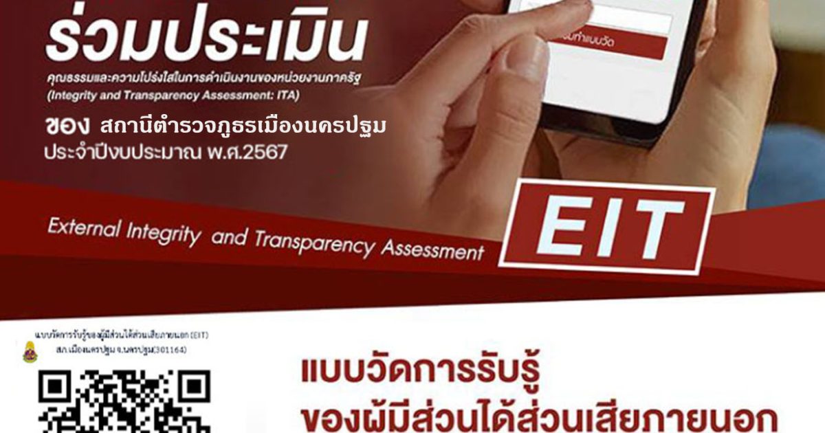 ขอเชิญผู้มารับบริการหรือมาติดต่อราชการร่วมประเมินคุณธรรมและความโปร่งใสในการดำเนินงานของหน่วยงานภาครัฐ (Integrity and Transparency Assessment : ITA) ประจำปีงบประมาณ พ.ศ. 2567 ของสถานีตำรวจภูธรเมืองนครปฐม ประจำปีงบประมาณ พ.ศ. 2567