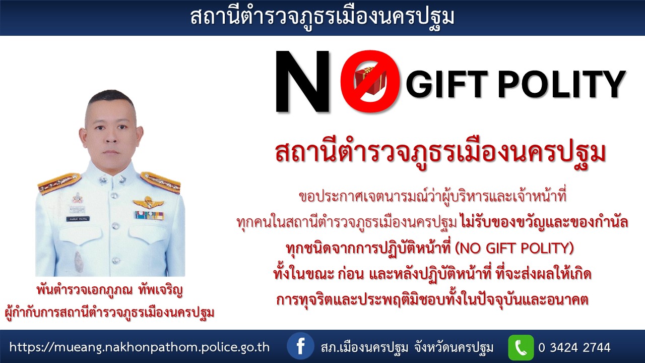 ประกาศสถานีตำรวจภูธรเมืองนครปฐม เรื่อง เจตนารมณ์ที่จะไม่รับของขวัญหรือของกำนัลทุกชนิดจากการปฏิบัติหน้าที่ (No Gift Policy)
