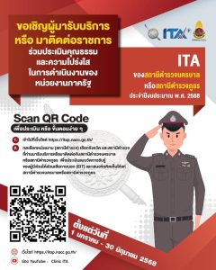 ขอเชิญผู้มารับบริการหรือมาติดต่อราชการร่วมประเมินคุณธรรมและความโปร่งใสในการดำเนินงานของหน่วยงานภาครัฐ (Integrity and Transparency Assessment : ITA) ประจำปีงบประมาณ พ.ศ. 2567 ของสถานีตำรวจภูธรเมืองนครปฐม ประจำปีงบประมาณ พ.ศ. 2567