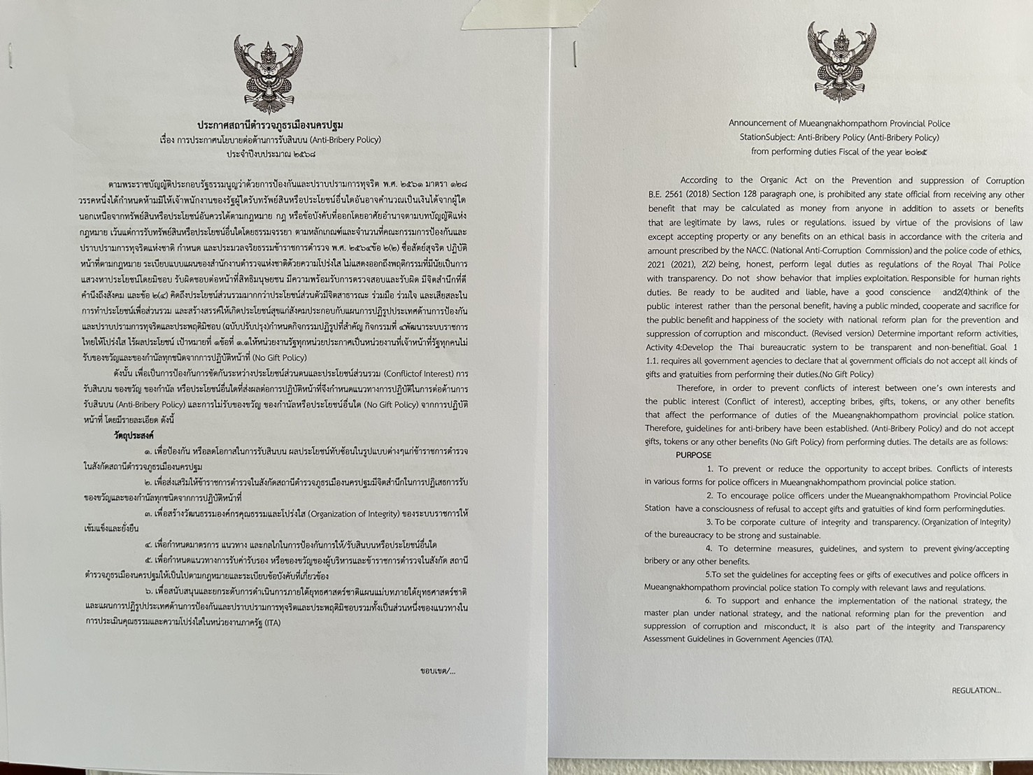 เจตนารมณ์ที่จะไม่รับของขวัญและของกำนัลทุกชนิดจากการปฏิบัติหน้าที่ (No Gift Policy) ฉบับภาษาอังกฤษ